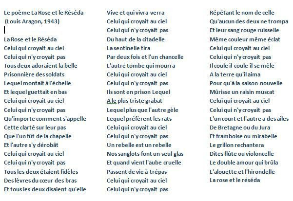 Le poème La Rose et le Réséda Louis Aragon 1943 La Rose et le Réséda Celui qui croyait au ciel Celui qui ny croyait pas Tous deux adoraient la belle Prisonnière des soldats Lequel montait à léchelle Et lequel guettait en bas Celui qui croyait au ciel Celui qui ny croyait pas Quimporte comment sappelle Cette clarté sur leur pas.