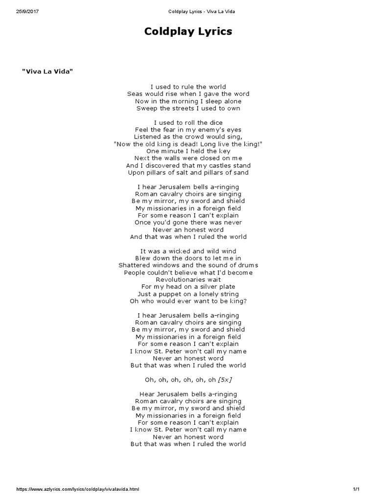 Coldplay rule the world. Coldplay - Viva La Vida is taken from the album Viva La Vida or Death and All His Friends released in 2008 hear the album at httpssmarturlitcoldplayviv. E A D G B E. C D never an honest word Bm Em But that was when I ruled the world Interlude C Em x3 D x2 C D G Em x2 Ohhhhh Ohhh Ohhh.