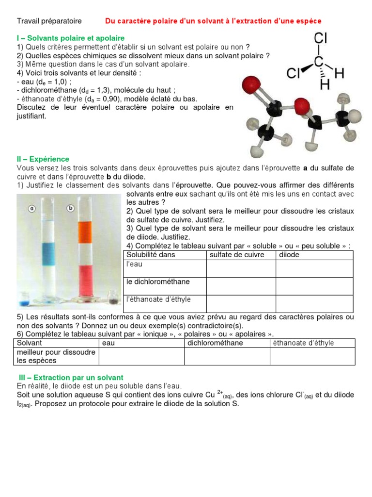 Pour cela on vous demande de lextraire du mélange vert grâce au solvant dextraction. Cette capsule suit la capsule sur les liaisons covalentes polarisées. Cest pour cela comme dit au dessus que pour solubiliser du diiode dans leau on rajoute du KI pour former le complexe I3- plus soluble.